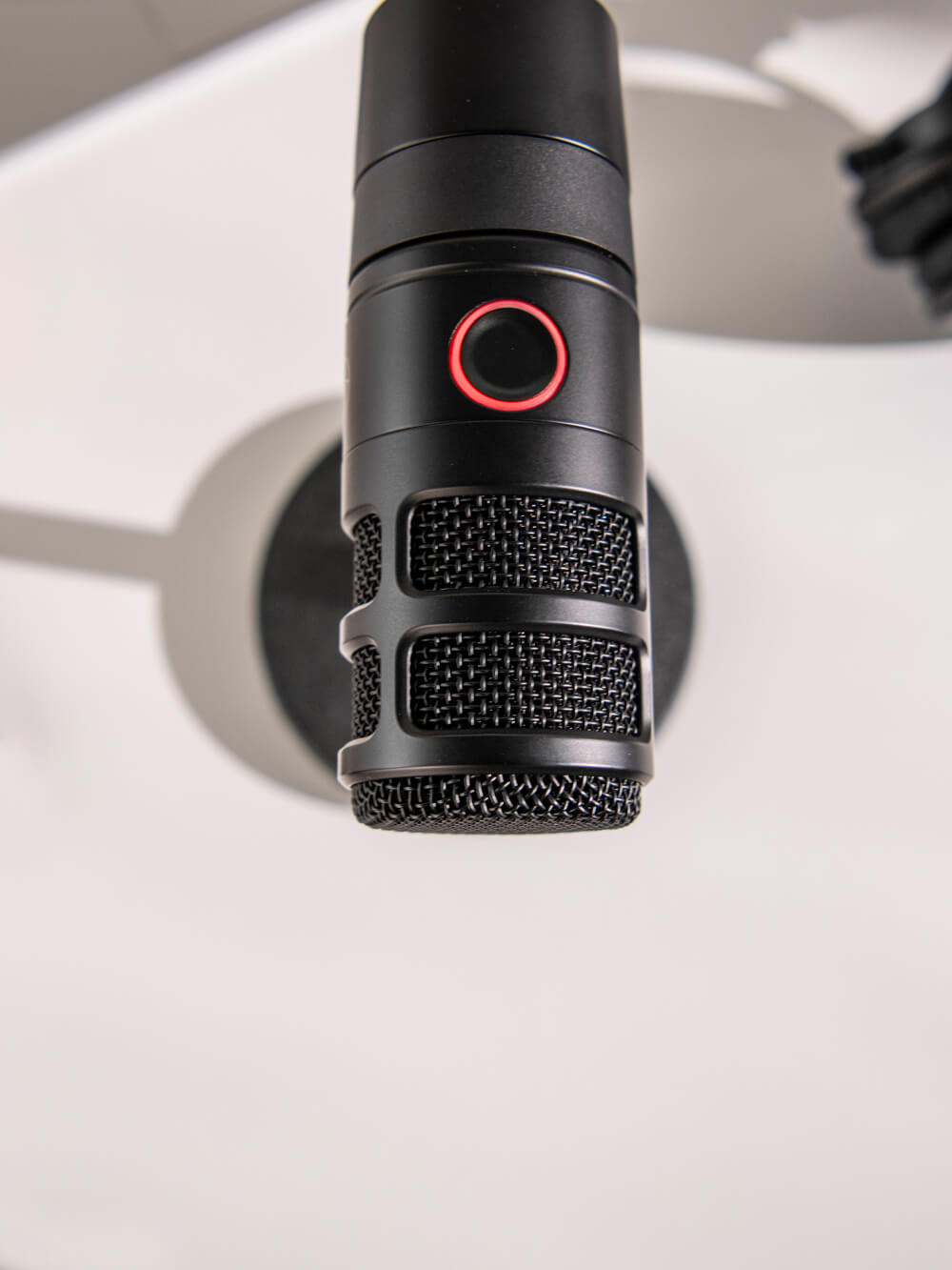 Ka trup metalik të fortë, shock mount të integruar, pop filter të brendshëm dhe buton “mute” me prekje për kontroll të shpejtë. Përveç kësaj, ofron dalje për kufje me zero latency për monitorim direkt.