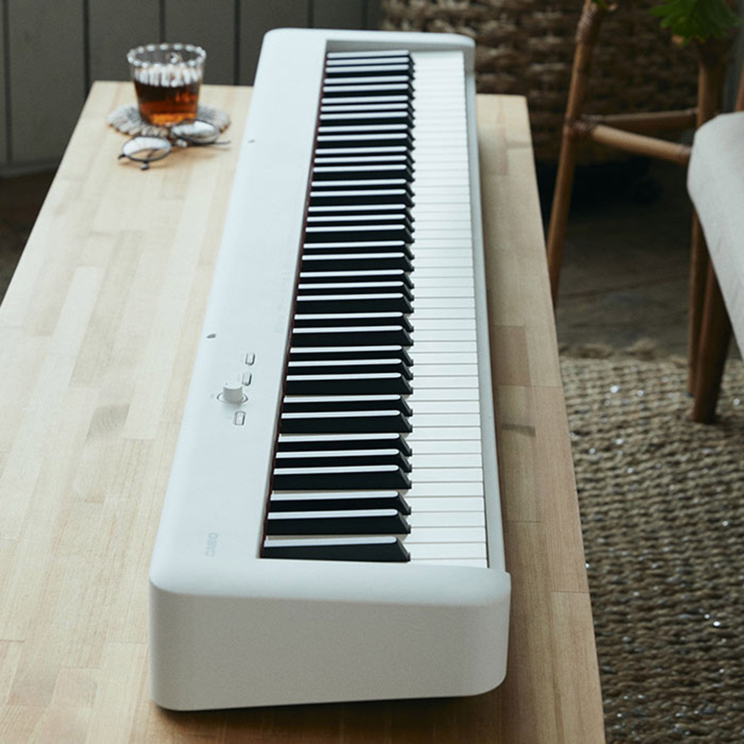 Casio CDP-S110 është një piano digjitale kompakte, e hollë dhe e lehtë, ideale për fillestarë dhe pianistë që kërkojnë praktikë kudo. Ofron 88 tasta me Scaled Hammer Action Keyboard II, 10 tinguj, pedal sustain SP-3, dhe mundësi lidhjeje përmes CASIO MUSIC SPACE app. Mund të funksionojë me bateri ose AC, duke e bërë të përshtatshme për çdo ambient dhe udhëtim muzikor.