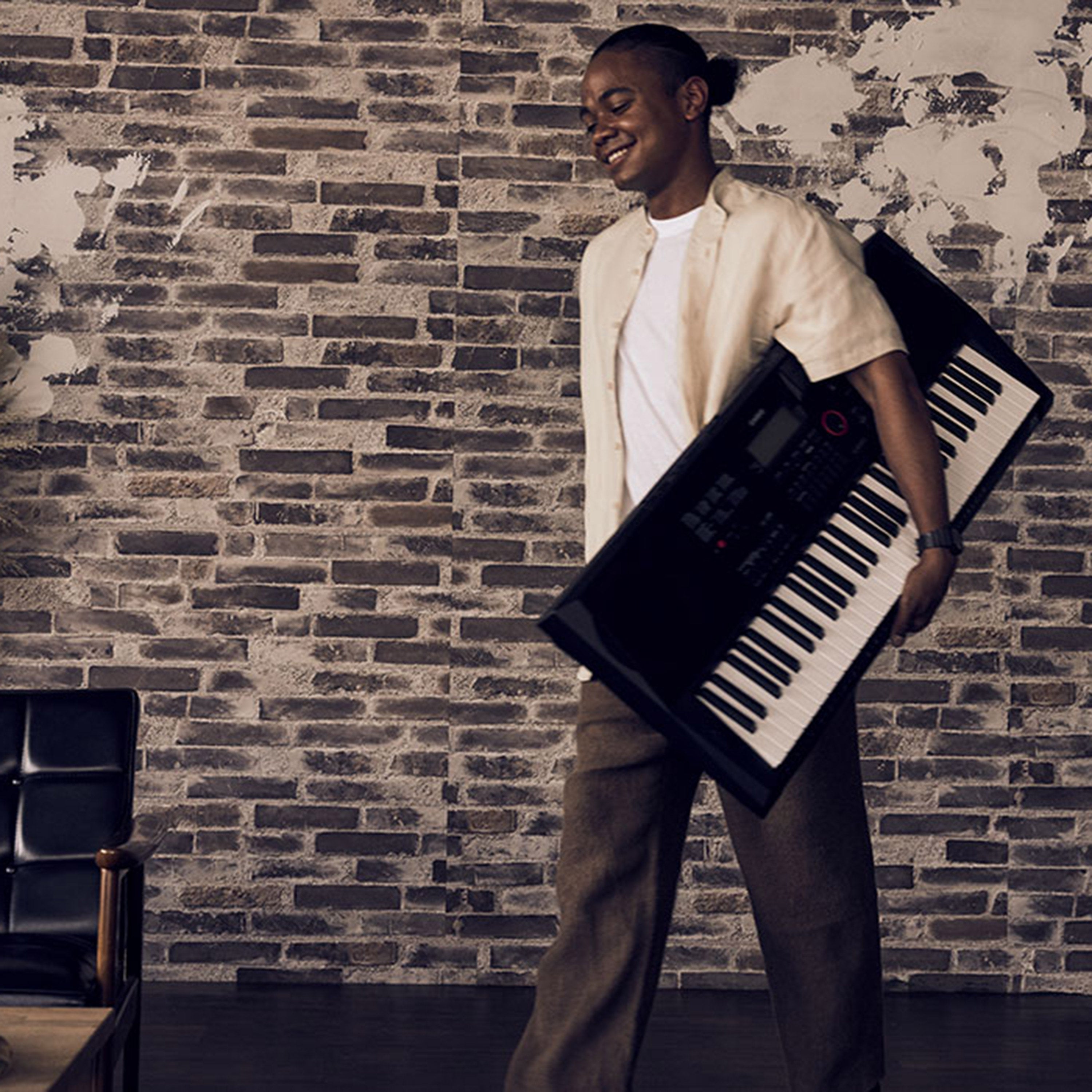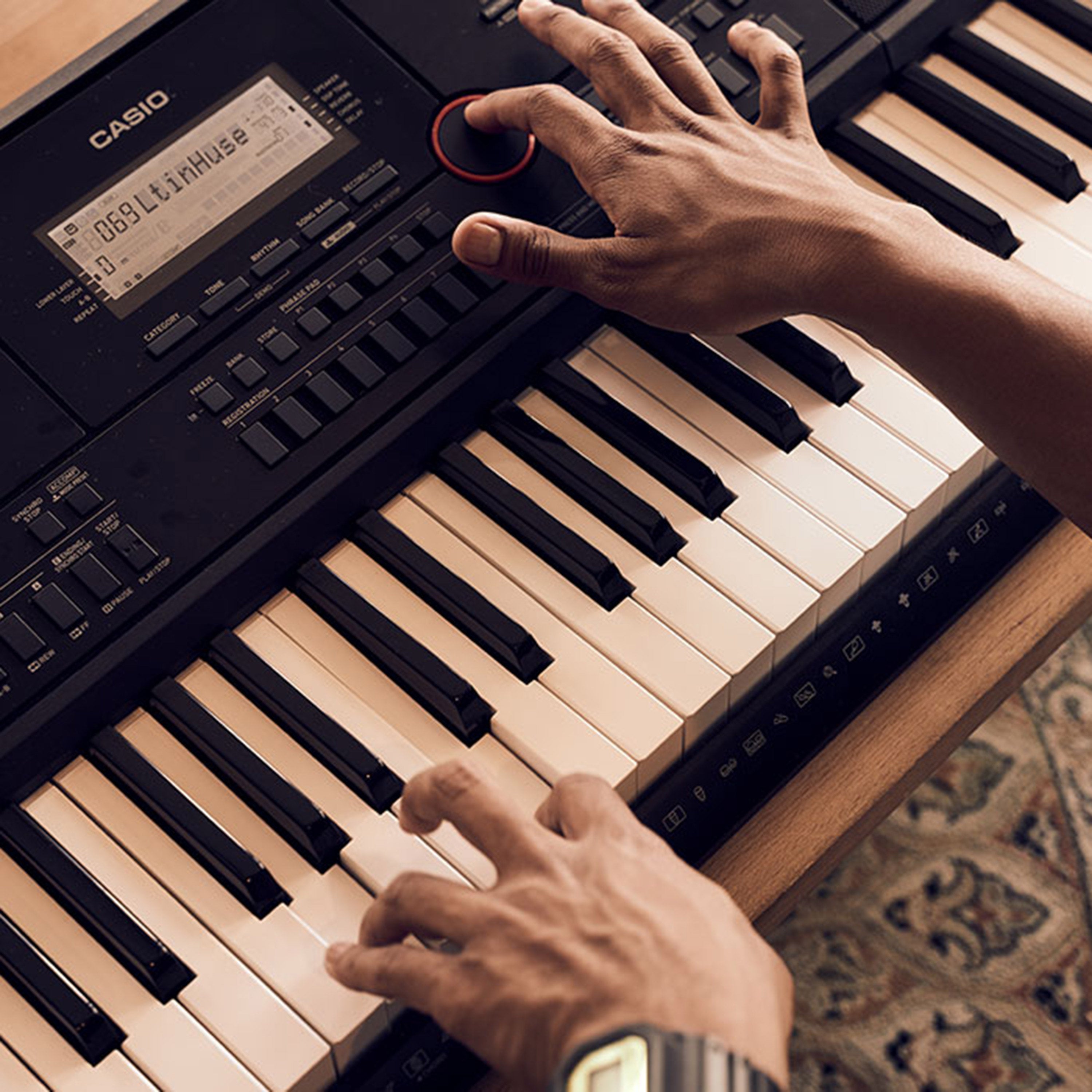 61 tasta, polyphony 64 nota, me mundësi ndarjeje (split) dhe shtimi (overlay) të tingujve.