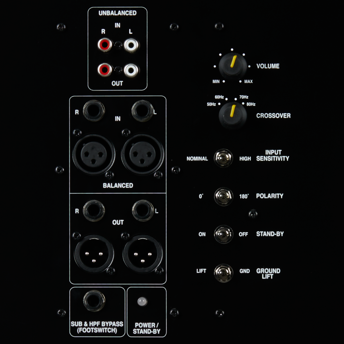 Polarity, Input Sensitivity, HPF Bypass (with footswitch), Four-position Crossover |