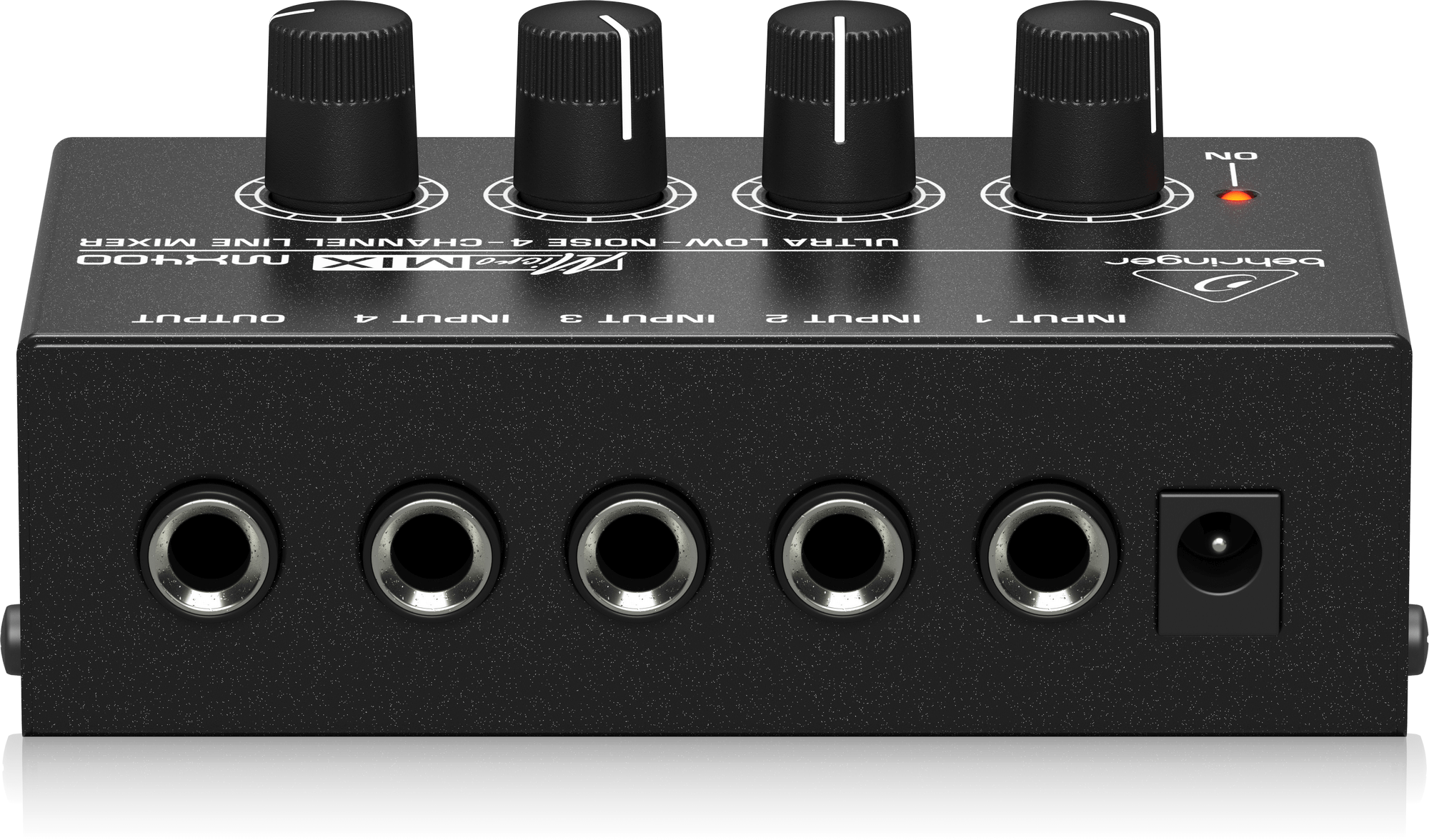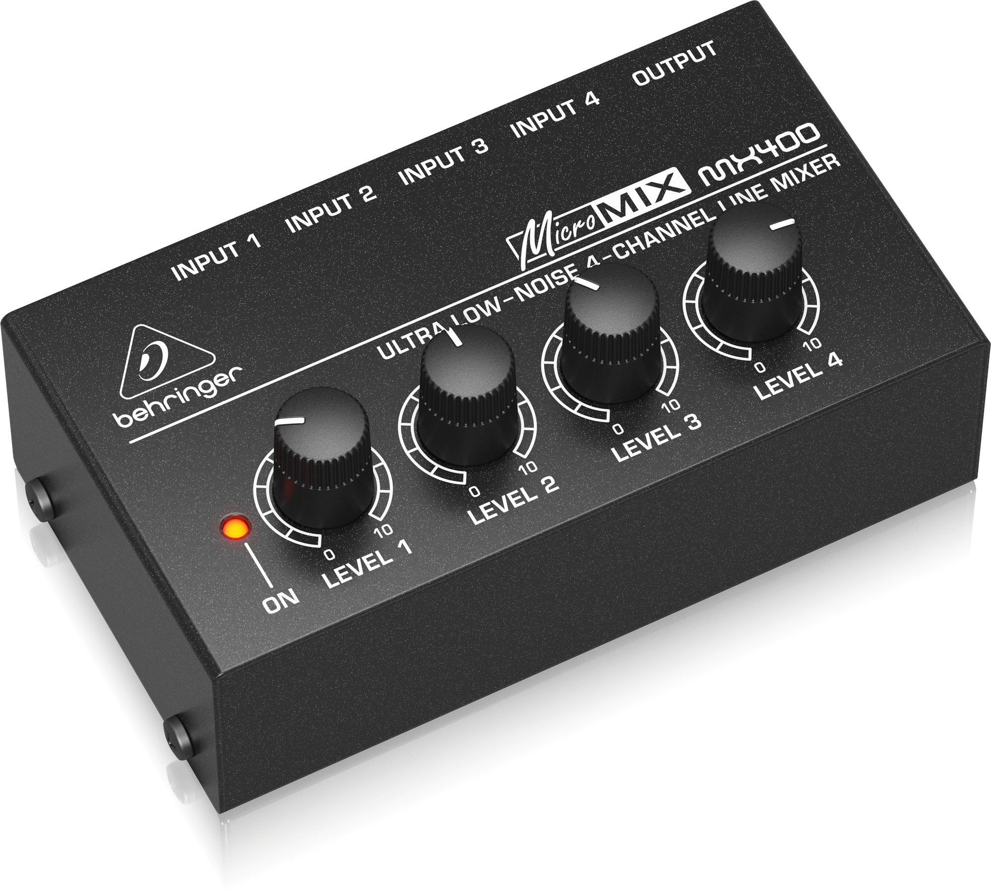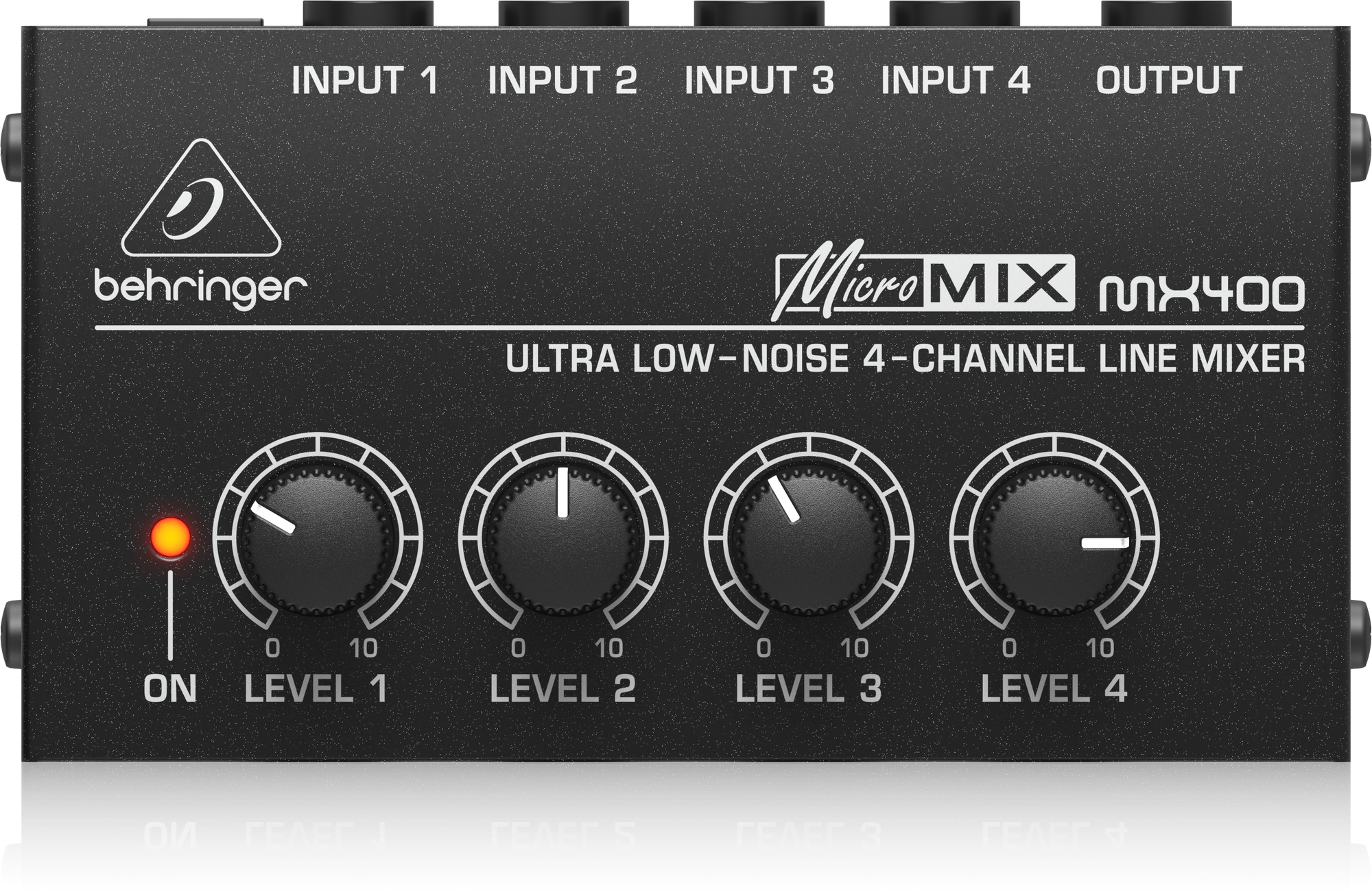 Behringer MX400 është një mikser linje me 4 kanale, ultra-kompakt dhe shumë praktik për studio, keyboard player-a apo çdo situatë ku duhen kombinuar disa burime line-level. Me çmim shumë të arsyeshëm, ai ofron kualitet të lartë tingulli, amplifikatorë të ulët në zhurmë dhe kontroll individual të nivelit për secilin kanal. Përdoret shpesh si sub-mixer për të shtuar instrumente shtesë në një mikser kryesor ose për aplikime të vogla live dhe studio.
