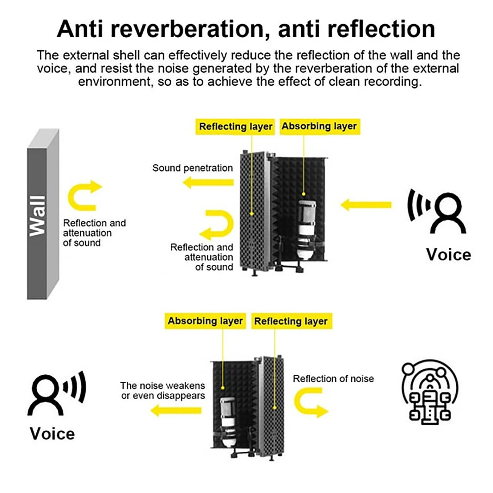 Microphone Shield me 3 panele është një zgjidhje ideale për kontrollin e tingujve gjatë regjistrimeve. Ky mbrojtës mikrofonash ndihmon në reduktimin e zhurmave të padëshiruara dhe echo-s gjatë procesit të regjistrimit, duke izoluar tingujt dhe përmirësuar cilësinë e zërit. Me një dizajn të thjeshtë dhe të efikas, ky Microphone Shield është i pajisur me tre panele që ofrojnë mbrojtje të plotë dhe mund të vendoset lehtësisht rreth mikrofonit tuaj. Është ideal për përdorim në studio regjistrimi, përpara mikrofonit, si dhe për performanca live. Dizajni i tij kompakt dhe portativ e bën atë të përshtatshëm për çdo mjedis.