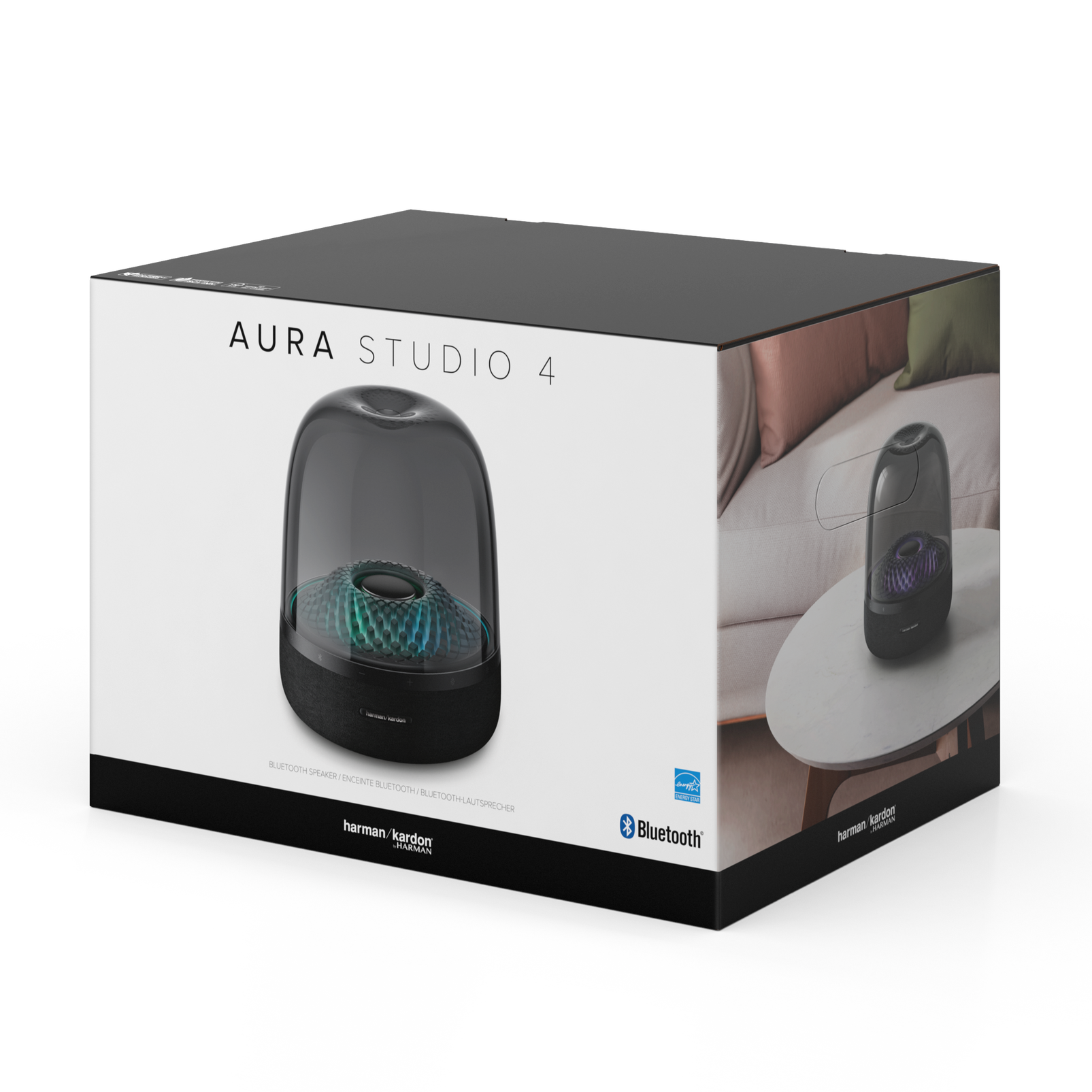 Harman Kardon Aura Studio 4 ofron tingull të jashtëzakonshëm dhe dizajn mahnitës. Altoparlanti ka një kupolë transparente që përhap dritë ambientale me efekt diamanti, duke krijuar një atmosferë vizuale që ndryshon me ritmin e muzikës. Mund të zgjidhni nga 5 tema të animuara për të përputhur dritat me muzikën tuaj. Bass-i i fuqishëm dhe tingulli i qartë, hapësinor, sjell një eksperiencë audio që mbush çdo dhomë. Lidhja Bluetooth lejon streaming të lehtë nga çdo pajisje mobile dhe mund të lidhen më shumë se një pajisje njëkohësisht.