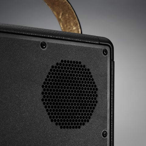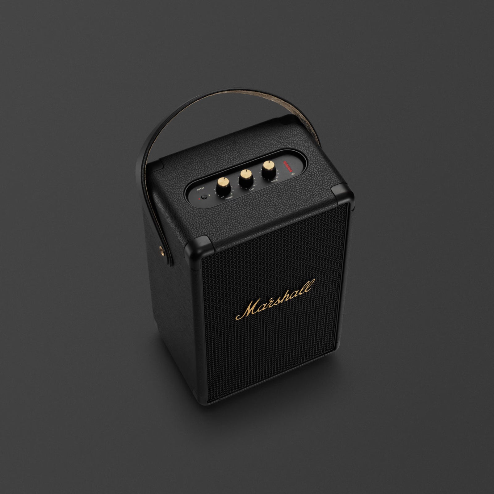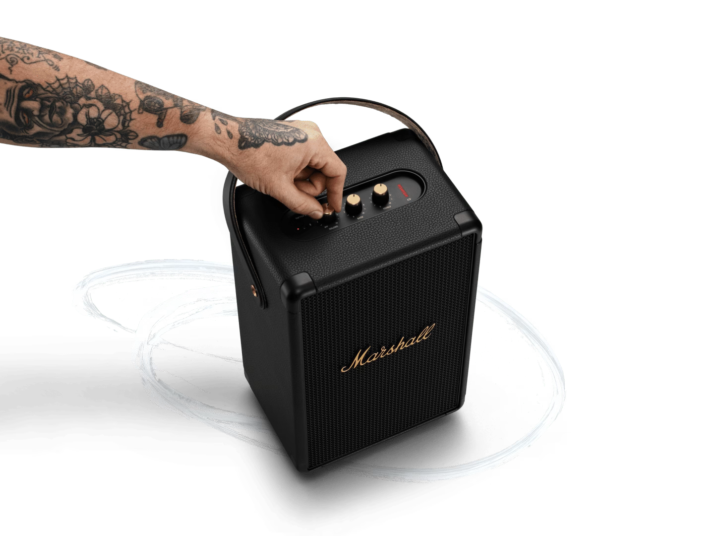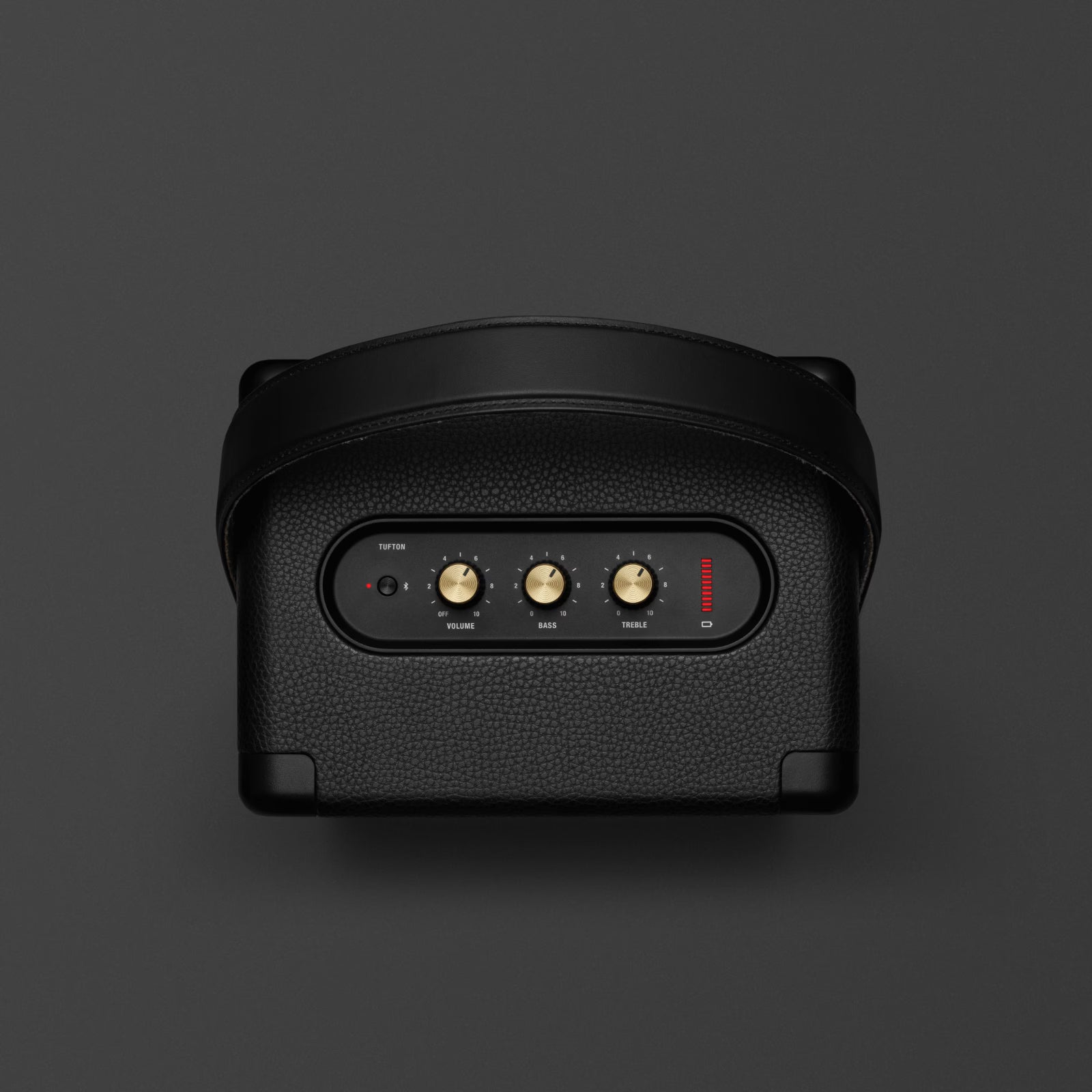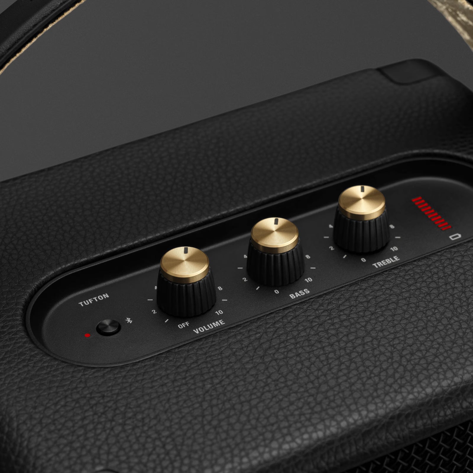 Bluetooth button, power/volume knob, bass knob, treble knob, battery indicator |